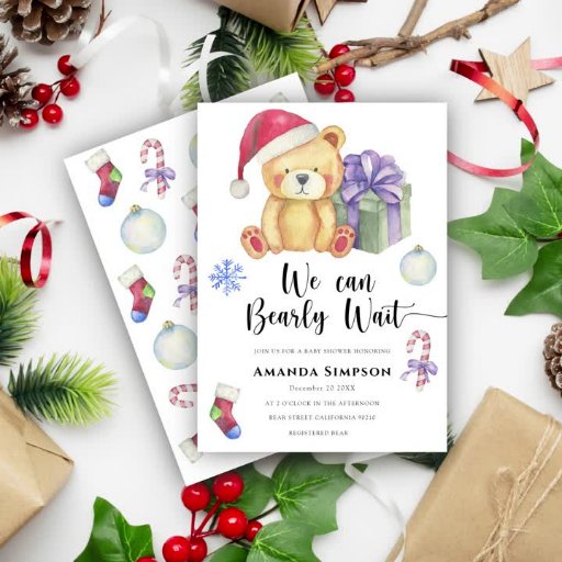 ¡Celebra con este fiesta de ducha de peluche con temática de oso de invierno! Acuarela lindo oso de peluche con regalo de navidades, con sombrero de santa. En el reverso de la tarjeta hay un patrón de navidades de vacaciones (bastón de caramelo, juguete de bola de árbol de navidad, medias de navidad). Elementos coincidentes disponibles.