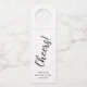 Estos sencillos y elegantes colgadores de botella dicen "cheers" en letra manuscrita de moda para un look moderno en blanco y negro.