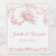 Agregue un toque de elegancia romántica francesa a su celebración de boda con esta etiqueta de botella de boda personalizada Toile de Jouy en suave rosa blush. Con un marco vintage ornamentado y una delicada ilustración de cupido y flores inspirada en grabados franceses del siglo XVIII, este diseño aporta un encanto atemporal y sofisticación refinada a la decoración de su mesa.