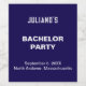 Etiqueta de botella de vino para despedida de soltero en azul oscuro y texto plano, un color para novios o anfitriones que asocian el azul con la confianza y la lealtad. Un diseño para novios o anfitriones que también prefieren texto plano sin elementos de fondo para mejorar la legibilidad. El texto blanco que contrasta sobre el fondo azul oscuro sólido y el uso de fuentes sans serif también mejoran la legibilidad y claridad. Personalice escribiendo el nombre del festejado, fecha y ubicación de la fiesta. Por favor revise la apariencia después de escribir el texto. Si la apariencia es de su agrado, puede realizar su pedido ahora. Si necesita cambiar el tamaño y reposicionar el texto para que se ajuste a esta etiqueta de botella, por favor ajuste en la herramienta de diseño. También puede cambiar el estilo de fuente, color de fuente y color de fondo en la herramienta de diseño. Etiqueta de botella para agregar un toque de personalización a sus bebidas. Al novio, celebre su última noche de libertad. Disfrute su última noche de soltero. Le deseamos todo lo mejor para su próxima boda y que su matrimonio esté lleno de amor