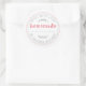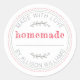 La etiqueta de cocina verde casera rústica presenta un fondo blanco crujiente con detalles de círculos cosidos y suaves acentos botánicos verdes, hermosamente combinados con un audaz texto "casero" en rojo. Perfecta para etiquetar productos horneados, mermeladas, conservas, frascos de conservas, bolsas de dulces y regalos caseros, esta pegatina redonda añade un toque cálido y personal a cualquier cosa hecha con amor. Los elementos verdes frescos aportan un ambiente alegre y natural, ideal para panaderos caseros, productores de alimentos caseros y regalos de temporada.