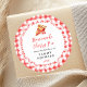 Esta divertida y caprichosa pegatina presenta una tarta de cereza sobre un encaje blanco y un fondo de gingham rojo. Es perfecta para etiquetar tus productos caseros. El texto combina fuentes de escritura a mano y serif para un estilo moderno y elegante.