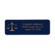 Esta elegante etiqueta de dirección de devolución de graduación de facultad de derecho personalizada azul marino y dorado presenta tipografía clásica para un graduado de la clase de 2026. Personalice con su dirección junto a las balanzas de la justicia para un gran accesorio de correo personalizado para abogados o abogados.