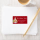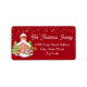 Esta etiqueta muestra un ilustracion festivo de los amigos de Santa sobre un fondo rojo oscuro.
