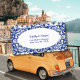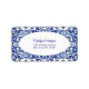 Etiqueta de dirección de devolución de cerámica blanca y azul italiana.