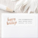 Un saludo de vacaciones clásico en un tratamiento tipo cobre cepillado (faux metallic). Añade tu dirección de regreso y haz que tus sobres destaquen esta temporada de vacaciones!