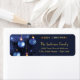 Diseño de etiqueta de dirección de devolución personalizable elegante y sofisticado con adornos navideños azules y letras doradas sobre un fondo azul oscuro. Personalice con su propio texto haciendo clic en el enlace "Personalizar esta plantilla".