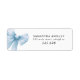 Agregue un toque suave y elegante a su correspondencia de ducha nupcial con esta Etiqueta de dirección de devolución con lazo azul Coquette. Con un delicado lazo azul pastel y tipografía clásica, esta etiqueta combina perfectamente con tarjetas de agradecimiento, invitaciones y sobres de regalo. Perfecta para crear un detalle final pulido y femenino que refleje el tema dulce y elegante de su ducha.