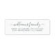 Moda, moderna etiqueta de dirección de retorno familiar en blanco y negro con su nombre familiar en caligrafía de escritura manuscrita elegante y fuera de negro y tipografía moderna y elegante. Simplemente agrega tu nombre y dirección. Diseñado exclusivamente para usted por Happy Dolphin Studio. Si necesita ayuda o productos coincidentes, póngase en contacto con nosotros en happydolphinstudio@outlook.com. ¡Estamos encantados de ayudarle a hacer de su boda el día más hermoso!