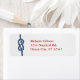Esta moderna etiqueta es ideal para un boda o un evento con temática náutica, oceánica o de playa. A la izquierda hay un nudo náutico con una textura de madera clara en el fondo. La paleta de colores rojo y azul completa el tema náutico.