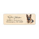 Estas impresionantes etiquetas de dirección de retorno con tu nombre en un tipo de letra de guión moderno y tu dirección en un tipo de letra sans serif limpio y emparejado con una adorable imagen de acuarela de un pastor alemán sobre un fondo de acuarela sería perfecta para todas tus necesidades de correo.