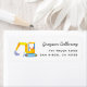 Etiqueta de dirección de retorno con un ilustracion acuarela de un bulldozer amarillo. Puedes usar esto para tarjetas temáticas de cumpleaños o de ducha de bebé.