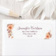 Elegantes etiquetas de dirección de devolución clásicas con flores y hojas en tonos marrones, naranjas, burdeos y amarillos. Fondo blanco.