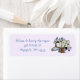 Etiqueta de dirección delgada de arte de buzón con tres líneas de texto negro impreso. Un buzón abierto con letras dentro y una venerable vid con flores azules es la obra de arte dibujada a mano en lápiz y pluma.