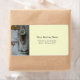 Etiqueta de dirección que muestra una imagen de una puerta antigua a la izquierda. La puerta está cubierta por pintura, perilla transparente y abertura de esqueletos. Personaliza tu nombre y dirección en gris a la derecha. Fondo blanco.