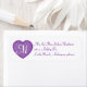 Etiquetas de dirección de retorno del boda de moda, hechas en blanco, con un corazón morado de aspecto purpurinoso, en el lado izquierdo, con un monograma blanco de una letra. Personalice el texto morado y el monograma para que se adapten a sus necesidades.
