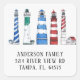 Diseño costero moderno con tres faros de rayas rojas, azules y verdes.
