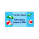 Una etiqueta de dirección personalizada con letras personalizadas azules y divertido arte temático de playa o piscina con una pelota de playa roja, paraguas solar verde sobre un fondo azul acuático con olas rizadas. Personalízalo para cambiar fuentes, elementos, tamaño de etiqueta y más, incluso guarda tu diseño para más adelante.