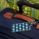 Etiqueta elegante del equipaje con un modelo azul, negro, y blanco clásico del argyle, en el frente. La parte posterior de la etiqueta se hace en negro sólido, con el texto de encargo blanco. Personalice el texto para adaptarse a sus necesidades. Los productos a juego del viaje están disponibles.