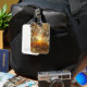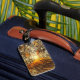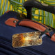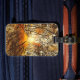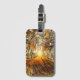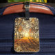 Presentando una de mis obras gráficas de arte de una puesta de sol a través de los árboles en un parque