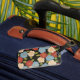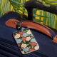 Etiqueta de equipaje con blues, rosa, verde y dora