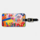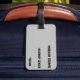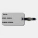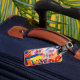 Etiqueta de equipaje de viaje con diseños, textos y fotos. Se utiliza en maletas, bolsos de viaje y otros equipajes, con información básica de contacto personal e identificación.