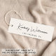 Elegante y moda ropa personalizado crema clara, accesorios, joyería, boutique, etc., etiqueta blanca colgar con un ambiente minimalista que incluye tu nombre o marca en un elegante guión distintivo. Añádase texto adicional a continuación y en la parte posterior en una tipografía moderna simple.