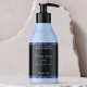 Esta elegante etiqueta de producto para botellas de cosmética presenta un fondo negro con un falso borde de Relieve metalizado purpurina azul. Esta etiqueta contiene espacio para el nombre de su producto, nombre comercial, peso del producto, ingredientes, instrucciones, medios sociales y dirección comercial.