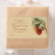 Un ilustracion de fresas con hojas verdes, en un fondo beige con texto de color ruso, de una pintura de época de Catharina o Catherine Klein, nacida en 1861. La etiqueta está preparada para el envasado o embotellado de mermeladas caseras, gelatinas y conservas. Puedes dejar el espacio de fecha para escribir, o cambiar a la fecha en que se hizo tu mermelada o jalea.