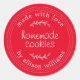 La Etiqueta de Galletas Caseras Rojo Rústico es una pegatina redonda con un fondo rojo brillante, letras blancas suaves y detalles de borde rústico cosido. Perfecta para galletas caseras, productos horneados, favores de fiesta y productos de cocina de lotes pequeños, esta etiqueta añade un toque cálido y personal a su embalaje. El mensaje de “hecho con amor” y la línea de nombre personalizable la hacen ideal para ferias de artesanías, regalos y marca de panadería casera.