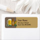 Ilustracion de cerveza. Botella, vidrio, abresivo, lúpulo y cebada. Color de fondo personalizado. Texto del personalizado para el nombre y la dirección.