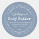 Etiqueta moderna, rústica y simple de mantequilla corporal casera hecha a mano con el texto hecho a mano, y tu sitio web de negocios en tipografía blanca moderna y caligrafía elegante con un fondo azul denim. Simplemente añade tu nombre, sitio web de negocios, el nombre del producto, los ingredientes y el peso a la etiqueta y estás listo para vender tus productos de belleza orgánicos hechos a mano! Diseñado exclusivamente para su pequeña empresa por Happy Dolphin Studio. Si necesita ayuda o productos coincidentes, por favor contáctenos en happydolphinstudio@outlook.com.