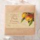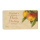 Un ilustracion de melocotones con hojas verdes, en un fondo beige con texto de color russet, hecho de una pintura vintage. La etiqueta está preparada para el envasado o embotellado de mermeladas caseras, gelatinas y conservas. Puedes dejar el espacio de fecha para escribir, o cambiar a la fecha en que se hizo tu mermelada o jalea.