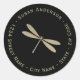 Esta etiqueta circular de dirección está decorada con elegante imagen vectorial de libélula purpurina falsa. El diseño circular lo convierte en un sello para sobres perfecto.
