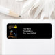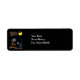 Esta etiqueta negra de la dirección de retorno de Halloween tiene a un niño lindo vestido con un disfraz de vampiro listo para una noche de truco o tratamiento. Lleva un balde de calabaza para sus dulces. Su gato negro está etiquetando buscando un regalo. En el fondo hay una luna llena y un grupo de murciélagos sobrevolando.