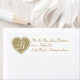 Etiquetas de la dirección de retorno del boda, hechas en blanco, con un corazón de tono dorado, a la izquierda, con un monograma blanco de una letra. Personalice el texto y el monograma marrón dorado para satisfacer sus necesidades.