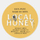 Una etiqueta informal para pequeños apicultores que prefieren una etiqueta subestimada. Etiqueta amarilla brillante con un goteo de miel de aspecto realista en la Y de las palabras LOCAL HONEY. Una linda abeja que vuela a través de las palabras en la etiqueta seguramente traerá algunas sonrisas.