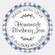 Etiqueta redonda de mermelada casera de arándanos gingham azul que presenta escritura a mano negra y acentos botánicos simples en un centro blanco. El formato redondo clásico y el suave cuadro azul crean una impresión cálida y rústica que combina perfectamente con frascos, productos horneados y regalos caseros. Personalice fácilmente con sus detalles.