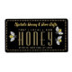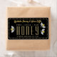 Texto dorado con abejas "ventanales", "Miel" escrito en letra decorativa. Borde con puntos dorados sobre la etiqueta negra de 2,375" L x 1,25" H (18 etiquetas por hoja) o 3,75" L x 2" H (8 etiquetas por hoja)