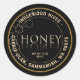 Personalice esta etiqueta de miel con su nombre colmenar, apicultor, dirección y peso neto. El peine de miel sobre fondo negro. La palabra HONEY está escrita en una fuente metálica de oro, y se refleja de nuevo bajo la palabra. Conversiones comunes de peso neto de miel: 8 oz (227 g), 12 oz (340 g), 16 oz (454 g), 32 oz (907 g), 5 lb (2,27 kg).