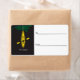 Etiqueta de Navidades de Kayak; adorno de kayak amarillo brillante en la rama del árbol; fondo negro; estilizado