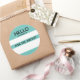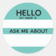 "Hola, mi nombre es" escribe en la etiqueta de nombre con un segundo espacio para "Pregúntame sobre". El invitado del evento puede escribir en su nombre y algo sobre ellos mismos para iniciar una conversación. El fondo verde azulado claro se puede cambiar a cualquier color que desee y todo el texto se puede editar. Ideal para reuniones, eventos de trabajo en red, fiestas.