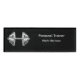 Plantilla de diseño de etiquetas de nombre personal de formador profesional con un símbolo de barras plateado y una plantilla de colocación de dos líneas que puede reemplazar con su propio nombre y título profesional. Usa esto cuando estés con los clientes o usa estos etiquetas como etiquetas de nombre para tu personal de gimnasio.