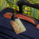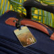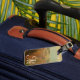 Colinas verdes onduladas en el lado del campo italiano otoño árboles frutales granjas monograma etiqueta de equipaje inicial