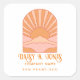 Etiqueta de producto empresarial de estilo boho de los 70 con amanecer naranja y montañas, con tipografía floreada retro. Un estilo de los 60 y 70. Agrega tu nombre, empresa y ciudad. La parte trasera de la tarjeta es naranja sólido con tipo blanco.
