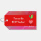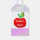 Maravillosa etiqueta de regalo para profesores (manzana roja con corazón rosa y franja de color con fondo rojo)
