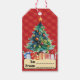 Etiqueta de regalo de color rojo brillante con un contrastante respaldo verde. Con un árbol de Navidad decorado y muchos regalos envueltos.