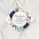 La etiqueta de regalo para la ducha de bebé incluye una hermosa corona floral azul marino y rosa azul cielo.