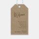 Etiqueta de regalo de bienvenida de boda, caprichosa minimalista moderna, tipografía de guion blanco personalizable. El fondo de textura impresa de lino de color beige añade un toque de sensación orgánica y elegancia clásica. Otros colores están disponibles.