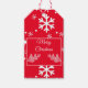 Copos de nieve blancos y árboles de Navidad en un fondo rojo. Por favor, cambie el nombre en el reverso de la etiqueta a su propio o elimine el cuadro de texto. Si te gusta un tema de envoltura, puedes encontrar una bolsa de regalo con el mismo diseño en la tienda The Beau Corner, con cinta de copos de nieve y papel de envoltura que combina perfectamente con este diseño. Si lo desea, puede cambiar el color de fondo al color.